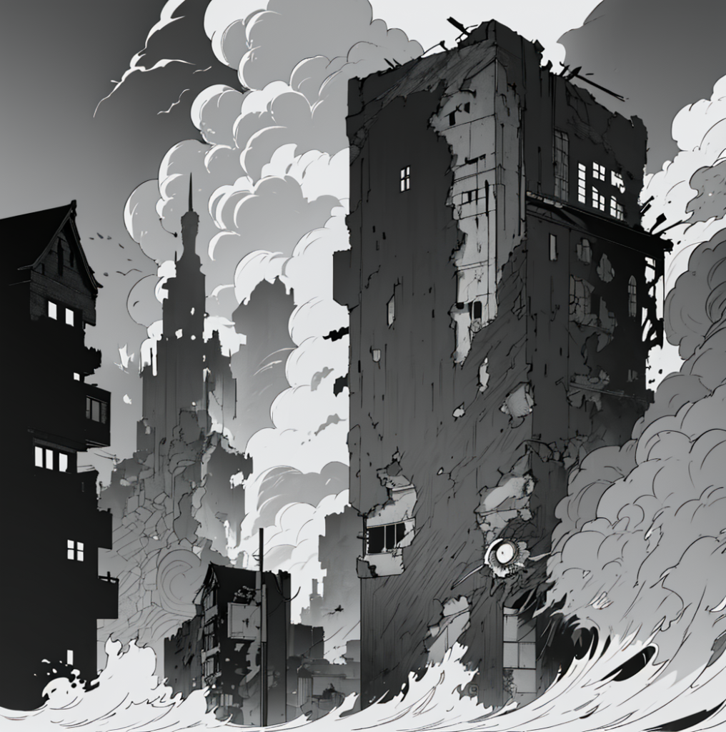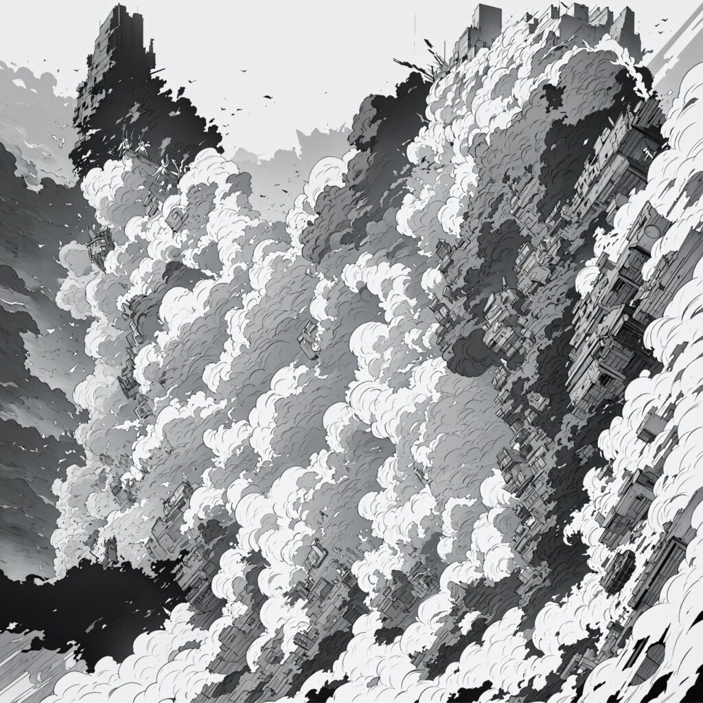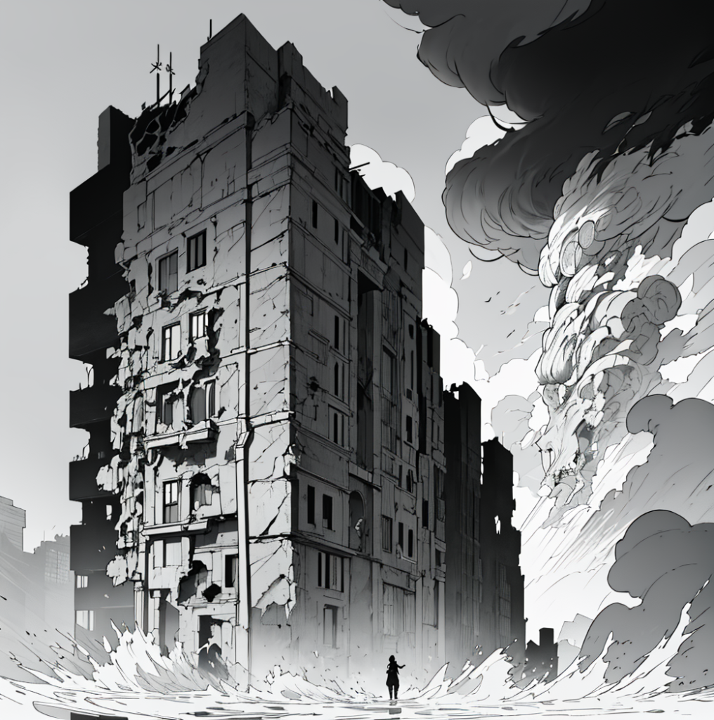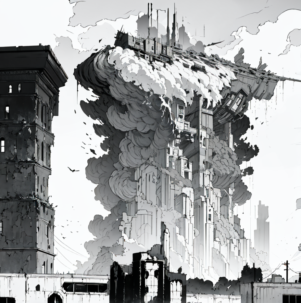 (masterpiece, best quality), striking depiction of a city in ruins, inspired by the iconic manga Akira. On the street, between crumbling, collapsed skyscrapers, their jagged edges protruding like broken teeth against a backdrop of smoky, foreboding skies. Convey the chaotic aftermath of a cataclysmic event, with streets torn asunder and a sense of desperation permeating the scene, a man alone looking at th sky, ((monochrome)), ((lineart)), ((plain black and white)), Capture the essence of Akira’s dystopian aesthetic, evoking both awe and unease, intricate linework and a gritty, realistic aesthetic, shading and cross-hatching,