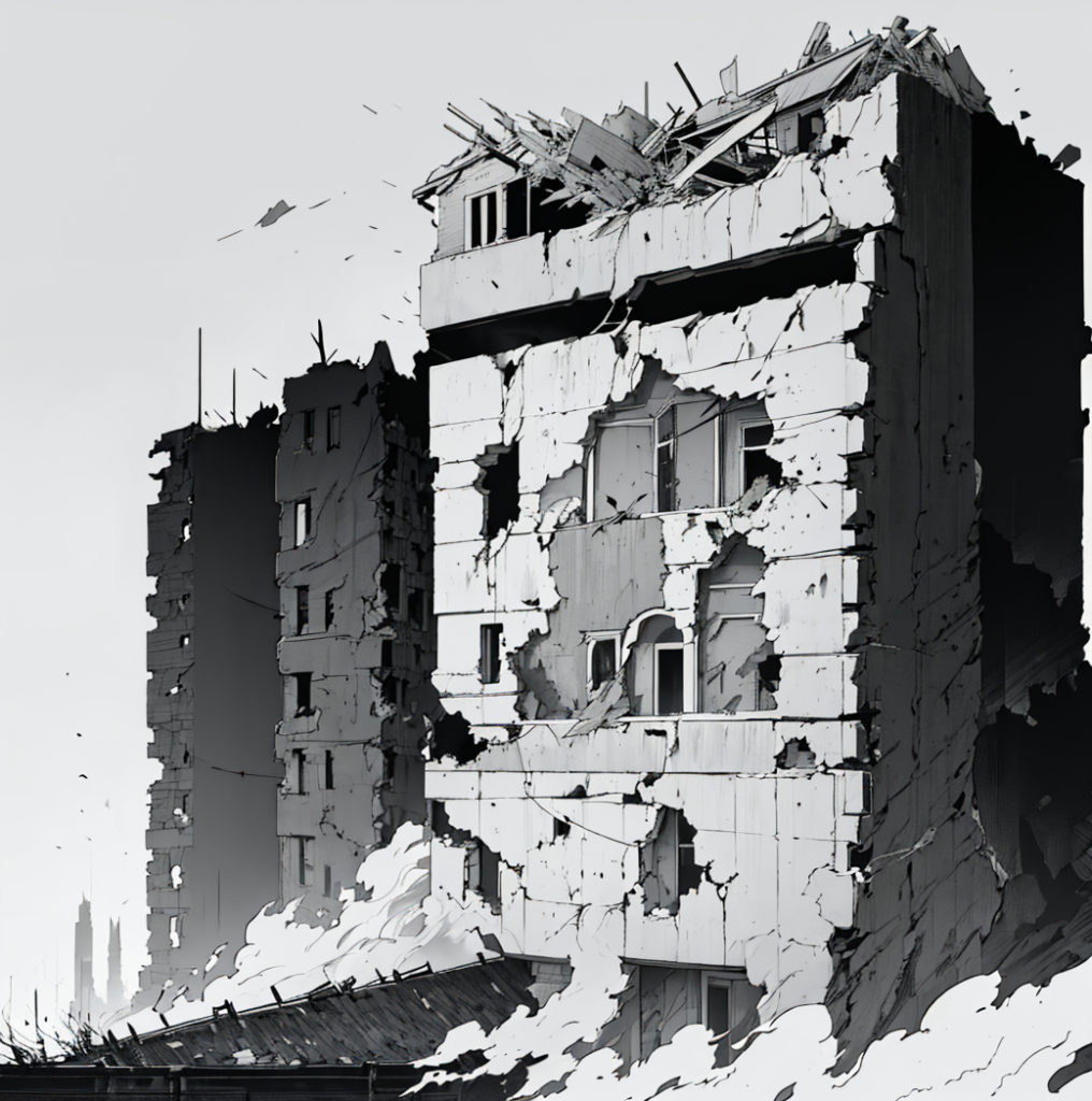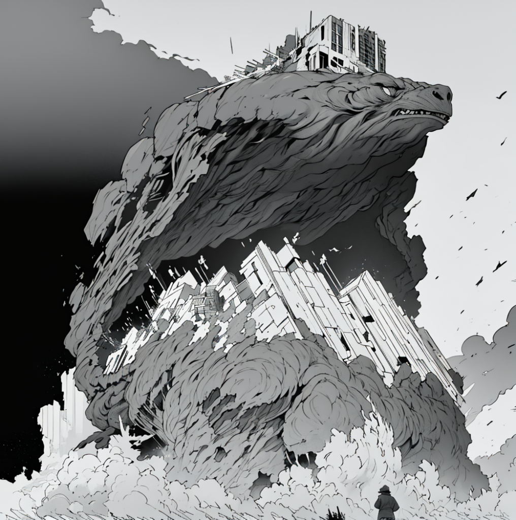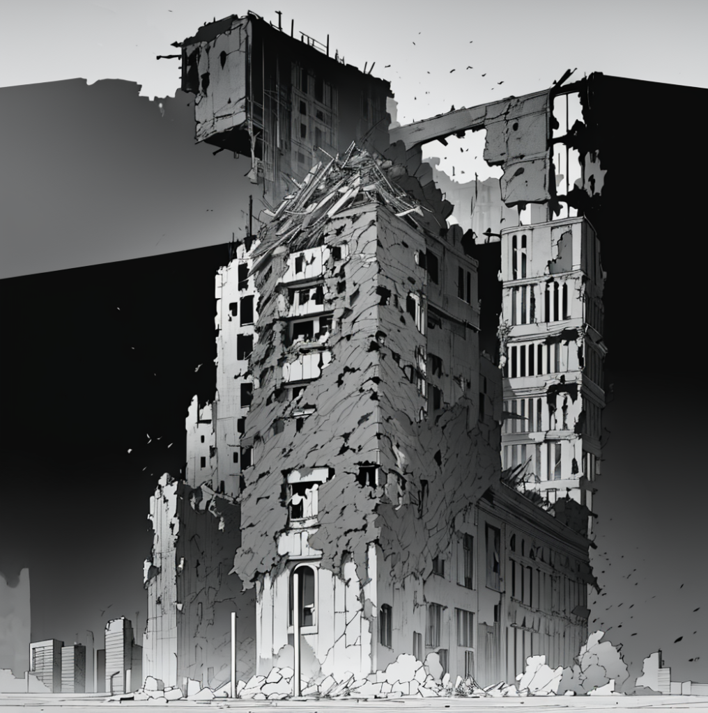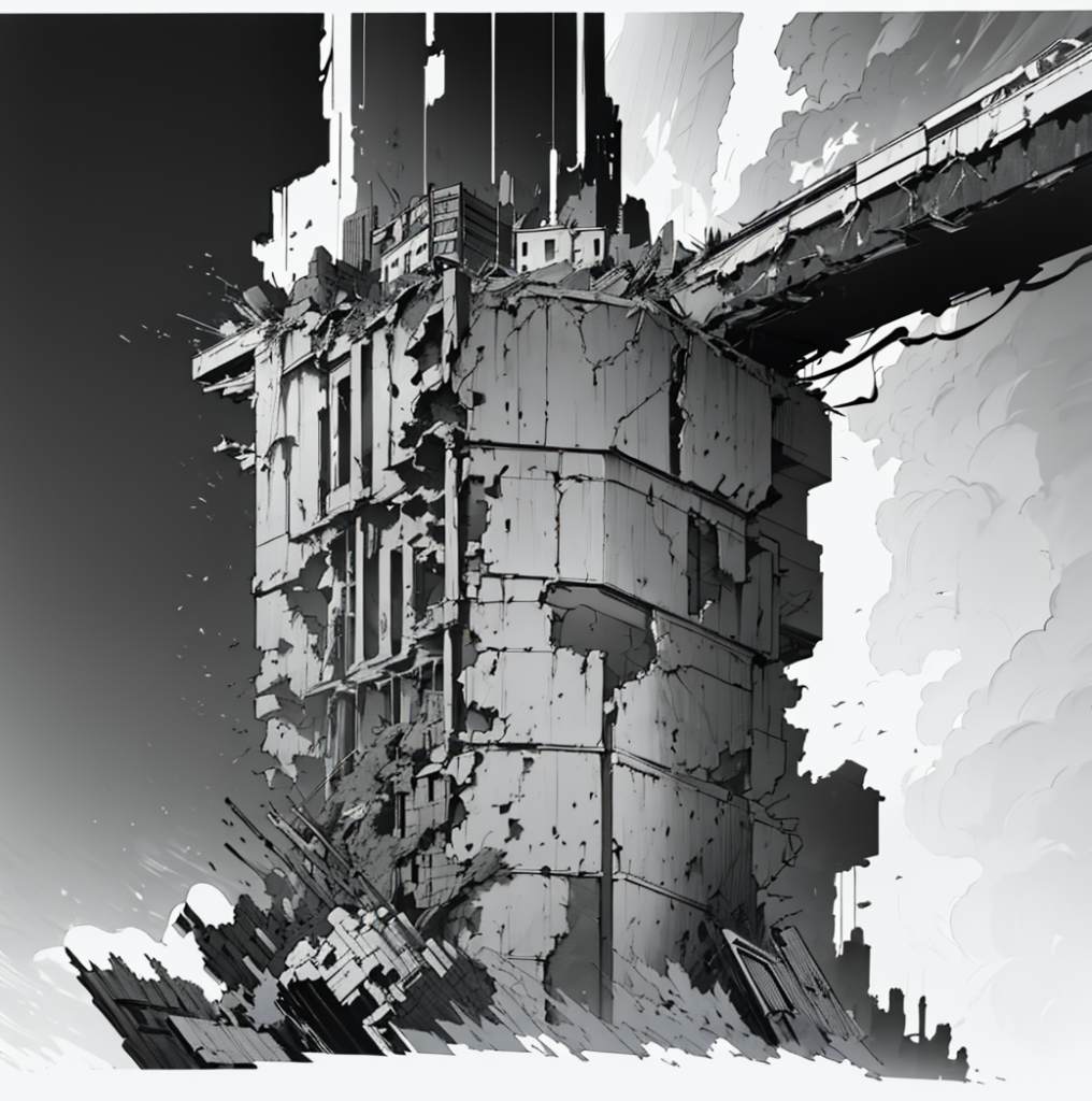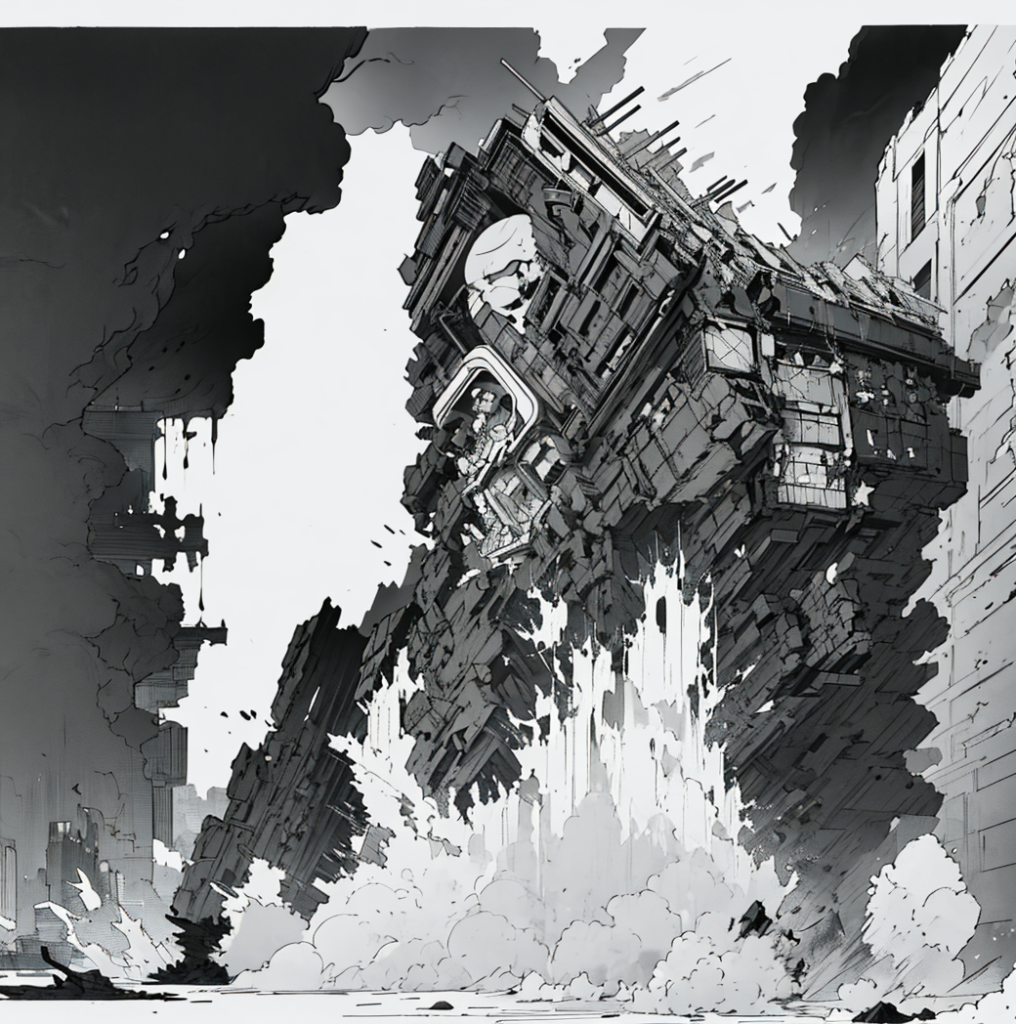 (masterpiece, best quality), striking depiction of a city in ruins, inspired by the iconic manga Akira. On the street, between crumbling, collapsed skyscrapers, their jagged edges protruding like broken teeth against a backdrop of smoky, foreboding skies. Convey the chaotic aftermath of a cataclysmic event, with streets torn asunder and a sense of desperation permeating the scene, a man alone looking at th sky, ((monochrome)), ((lineart)), ((plain black and white)), Capture the essence of Akira’s dystopian aesthetic, evoking both awe and unease, intricate linework and a gritty, realistic aesthetic, shading and cross-hatching,